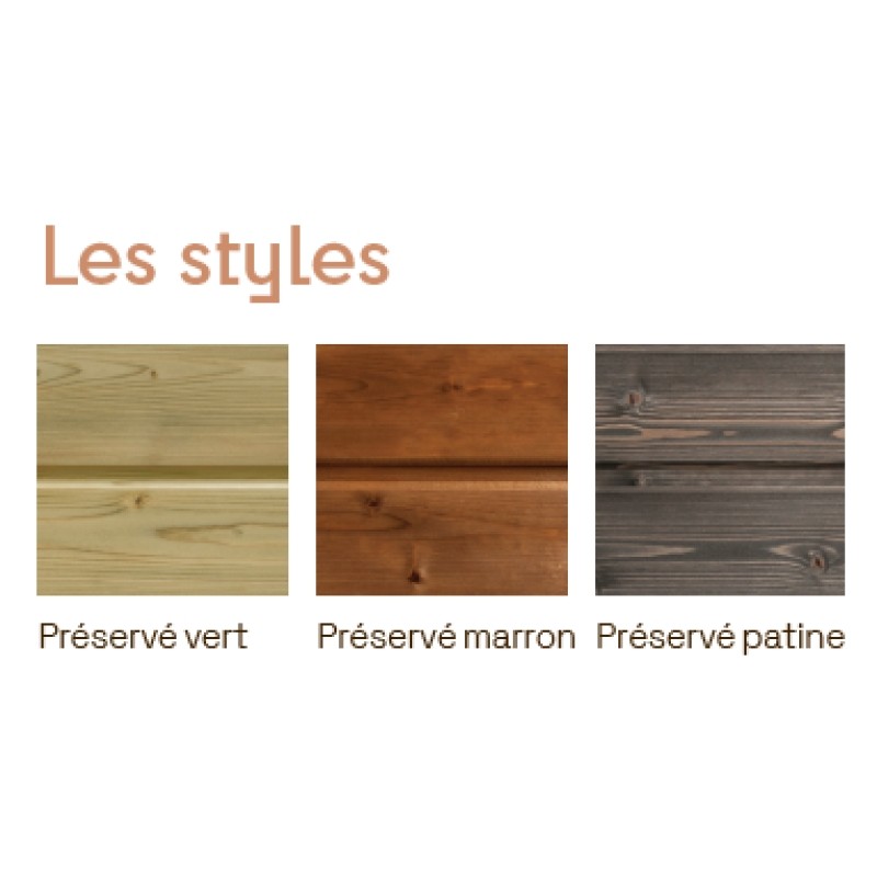 Sapin du Nord. Préservation : préservé Classe 3.1 autoclave vert et marron. Préservation : préservé Classe 3.1 en line flow patine, à partir de composants biosourcés.3 profils claire-voie : Rythmix® Biseau 21x58 mm / 40x40 mm, Rythmix® Carré 40x40 mm, Triptyk 21x40 mm / 21x90 mm / 21x140 mm. 9 profils à emboitements : Line 20x125 mm, Pulse 20x125 mm, Eskis 26x125 mm, Tempo 26x125 mm, Faux Claire-Voie XXL 26x130 mm, Faux Claire-Voie XL 40x105 mm, Moutiers 18x132mm, Montana 20x132 mm, Couvre-Joint 27x172 mm.Surface rabotée pour le préservé vert et le marron. Surface rabotée brossée pour le patine. Rainage en bout (sauf Rythmix® et Triptyk). Pose en fixation apparente. Réaction au feu : F (profils claire-voie) & D-s2, d0 (profils à emboitements).Conseil de l'expert : La préservation Patine offre le parfait équilibre entre la protection contre les intempéries et l'anticipation du grisaillement naturel. Conseil de l'expert : Mixez les largeurs et/ou épaisseurs : Line et Pulse ou encore les Triptyk avec les Rythmix® Carré pour donner un aspect 3D !