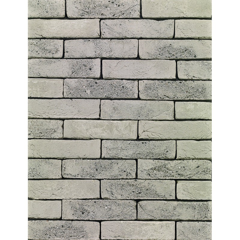 Brique aux arêtes irrégulières de couleur gris clair à gris foncé, avec poudrage blanc épars et traces noires clairsemées. Disponible en brique pleine, plaquette et angle.