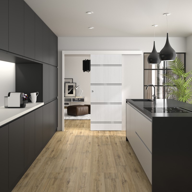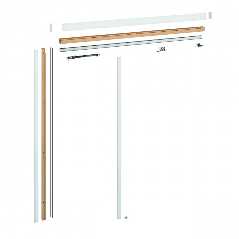 Plus produit pour l’utilisateur : bandeau de finition en MDF hydrofuge enrobé blanc prêt-à-peindre, cache-rail en pin enrobé blanc, rail en aluminium anodisé et chariot à roulements haute qualité étanches garantissant un coulissement parfait et durable, amortisseur de fermeture anti pince-doigt et ralentisseur à l'ouverture intégrés au rail aluminium. Butée et guide au sol.