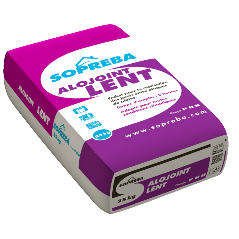 L’ALOJOINT LENT 8 H s’applique en intérieur entre plaques de plâtre à bords amincis. Enduit à temps de prise long, peut être utilisé pour la finition.