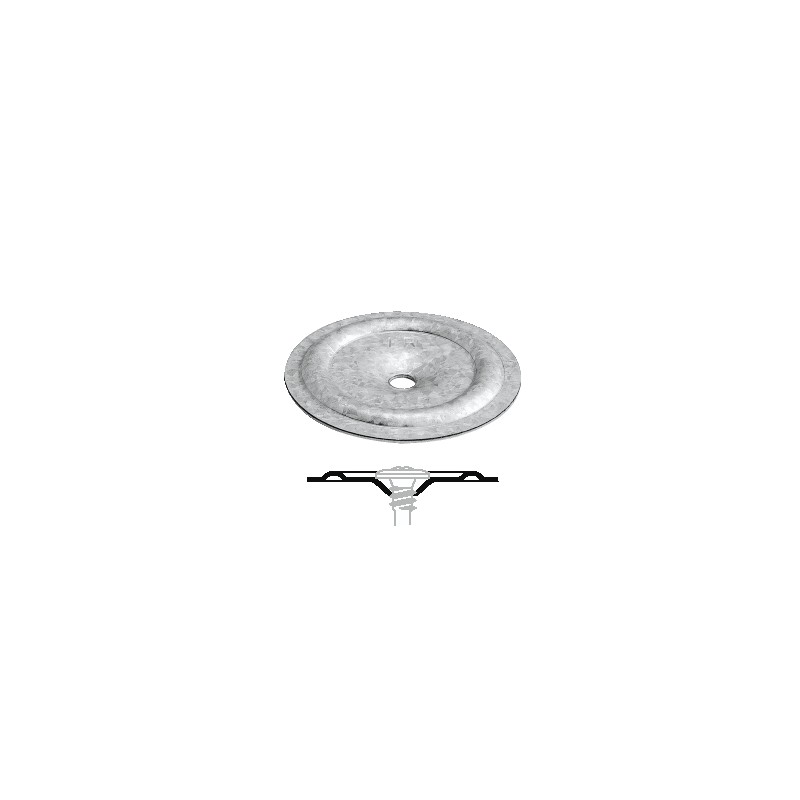 Rondelle métallique de répartition à cuvette épaisseur 8/10e Ø 40. Matière : alliage alu/zinc. S'utilise avec des vis à tête plate double filet type EVDF (Solide au pas). Rondelle de répartition pour membrane.