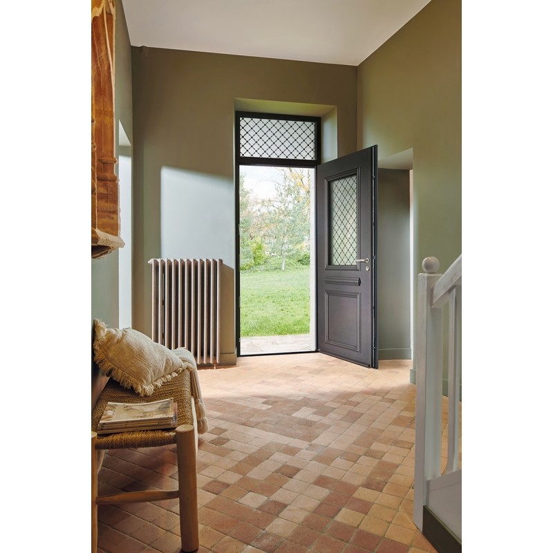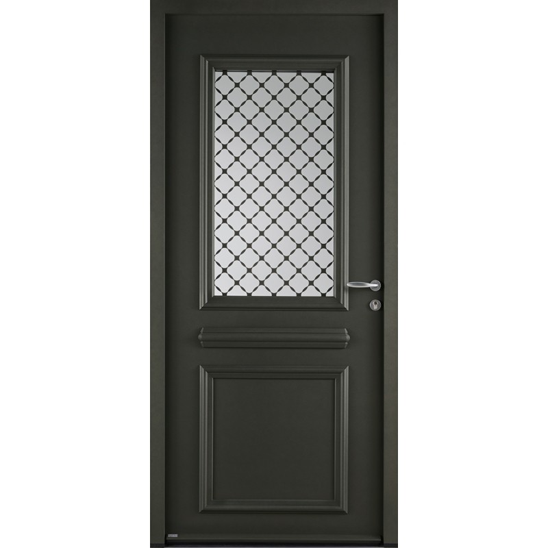 Une porte au style traditionnel en acier, qui associe une cimaise tout en légèreté, à une sérigraphique esprit grille dans le vitrage (gris 7022). Hauteur : 1934 à 2250 mm. Largeur : 739 à 1011 mm. Isolation thermique : Ud=1,1 W/m².k
