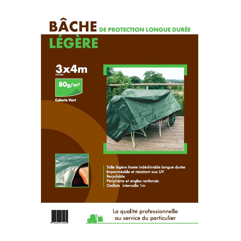 Bâche légère 80 g/m². Dimensions 3 x 4 m. Toile imperméable, résistante aux UV, œillets aluminium intervalle 1 m, périphérie renforcée, recyclable.