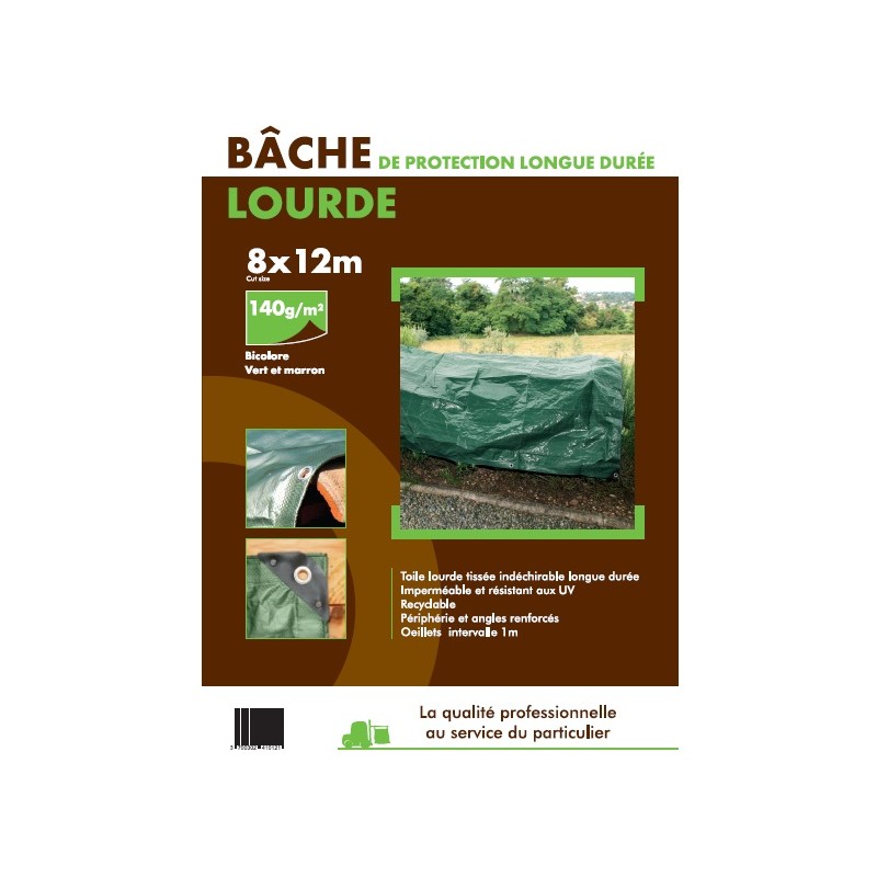 Bâche lourde 140 g/m². Dimensions 8 x 12 m. Toile imperméable, résistante aux UV, œillets aluminium intervalle 1 m, périphérie et angles renforcés, recyclable.