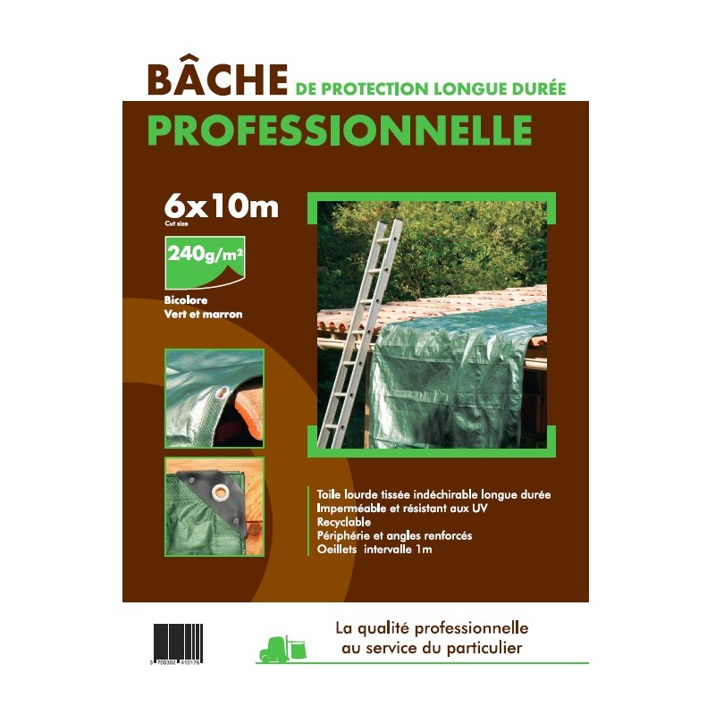 Bâche pro 240 g/m². Dimensions 6 x 10 m. Toile imperméable, résistante aux UV, œillets aluminium intervalle 1 m, périphérie et angles renforcés, recyclable.